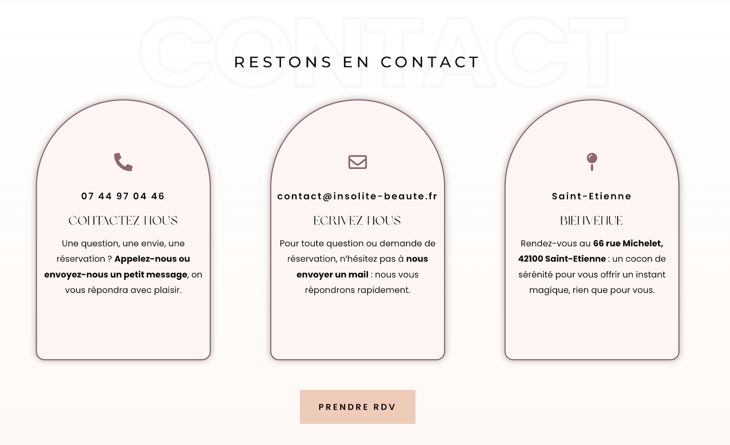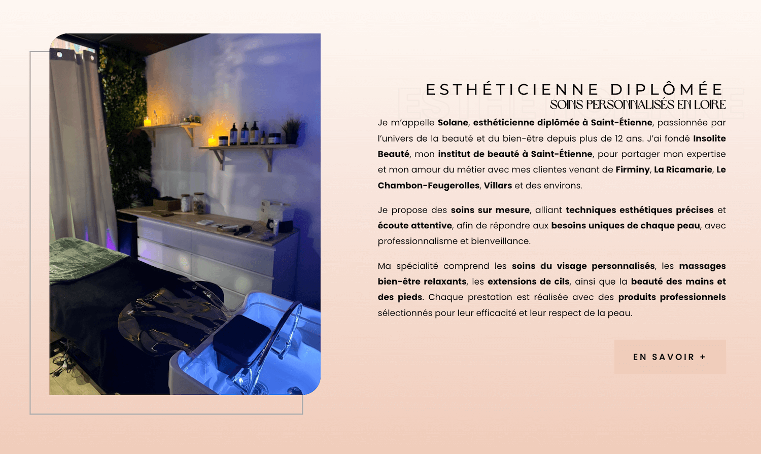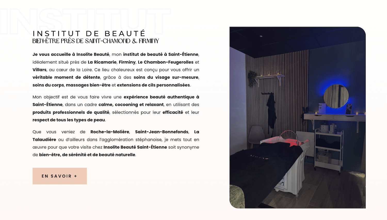 Conception et développement complet du site vitrine d’Insolite Beauté, institut de beauté et bien-être situé à Saint-Étienne, à proximité de La Ricamarie, Firminy, Le Chambon-Feugerolles et Villars.
