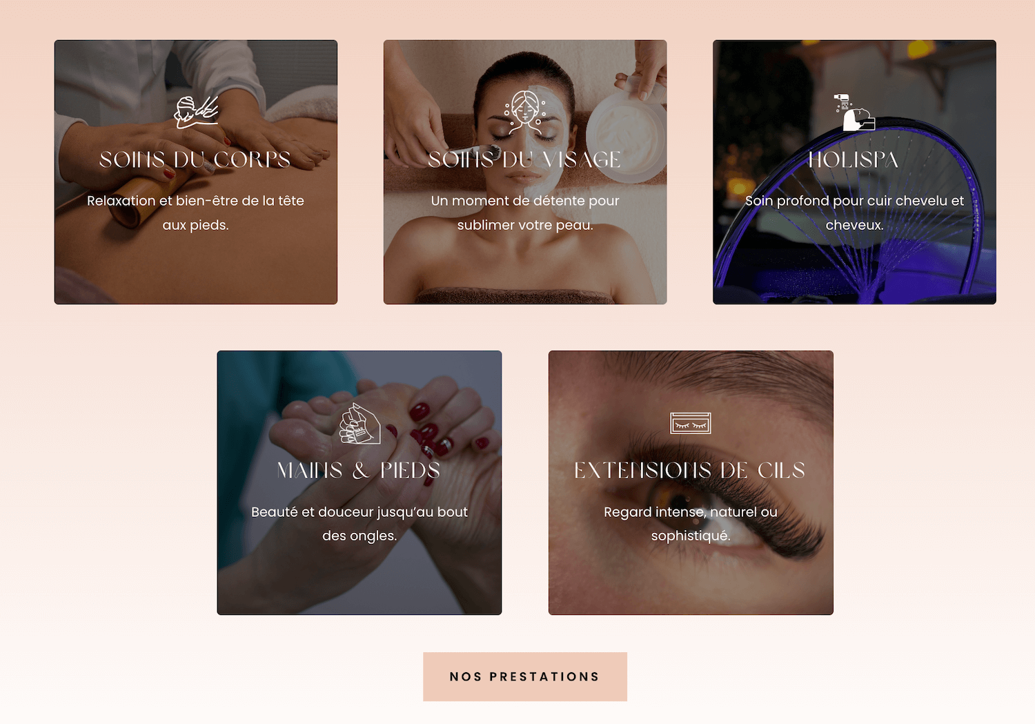 L’objectif était de créer une présence digitale à l’image de l’univers doux, élégant et authentique de l’institut — un espace cocooning où chaque cliente vient se ressourcer pour des soins du visage sur-mesure, soins du corps, massages bien-être et extensions de cils personnalisées. Le site devait retranscrire cette atmosphère chaleureuse dès les premières secondes de navigation, tout en convertissant les visiteurs en prises de rendez-vous.